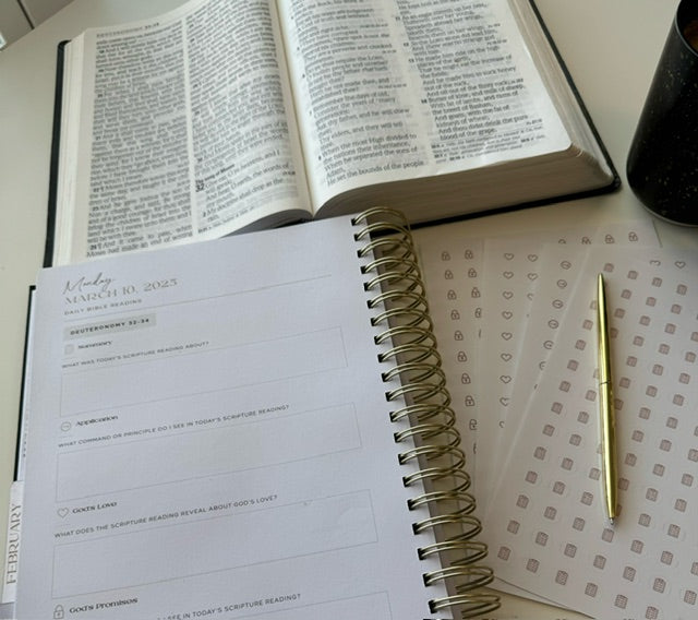 Black Linen Cover, Gold Spiral Bind, 100 GSM Bleed Free Paper, Back Pocket, Elastic Strap, Gold Corners, Bible Reading Stickers, Plastic & Ribbon Bookmarks, Bible Reading Plan